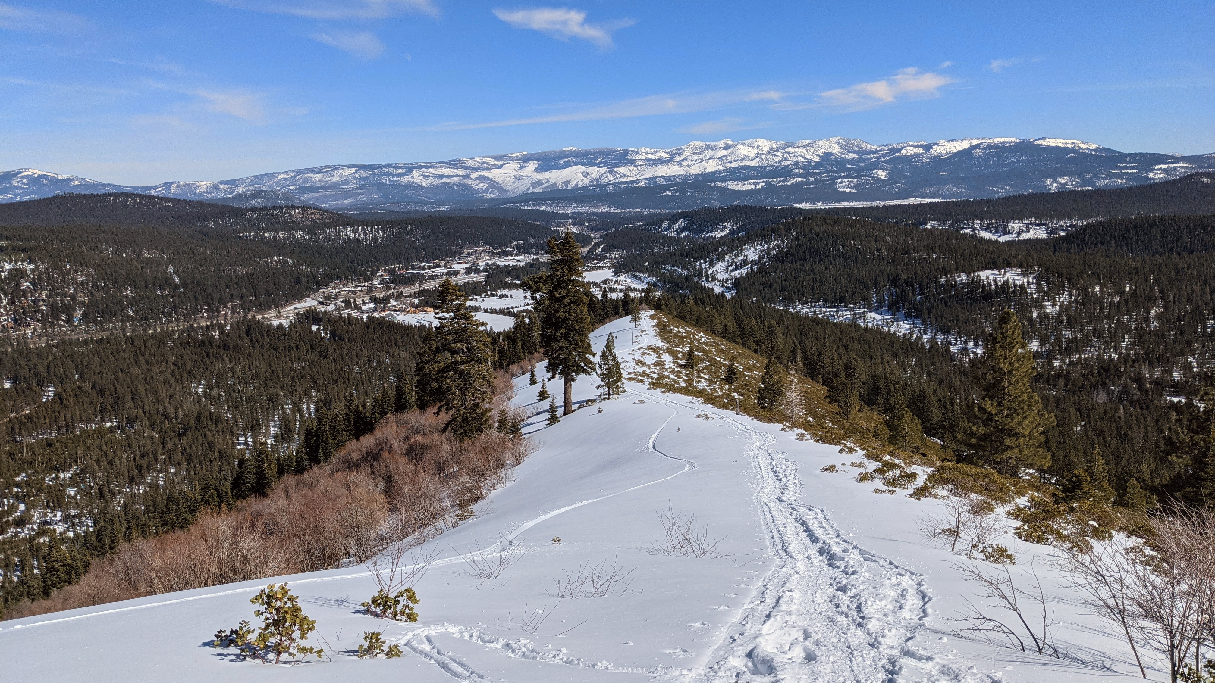 A view of Donner Pond, frozen. We walked across the ice in our showshoes, but only where we saw recent footprints.